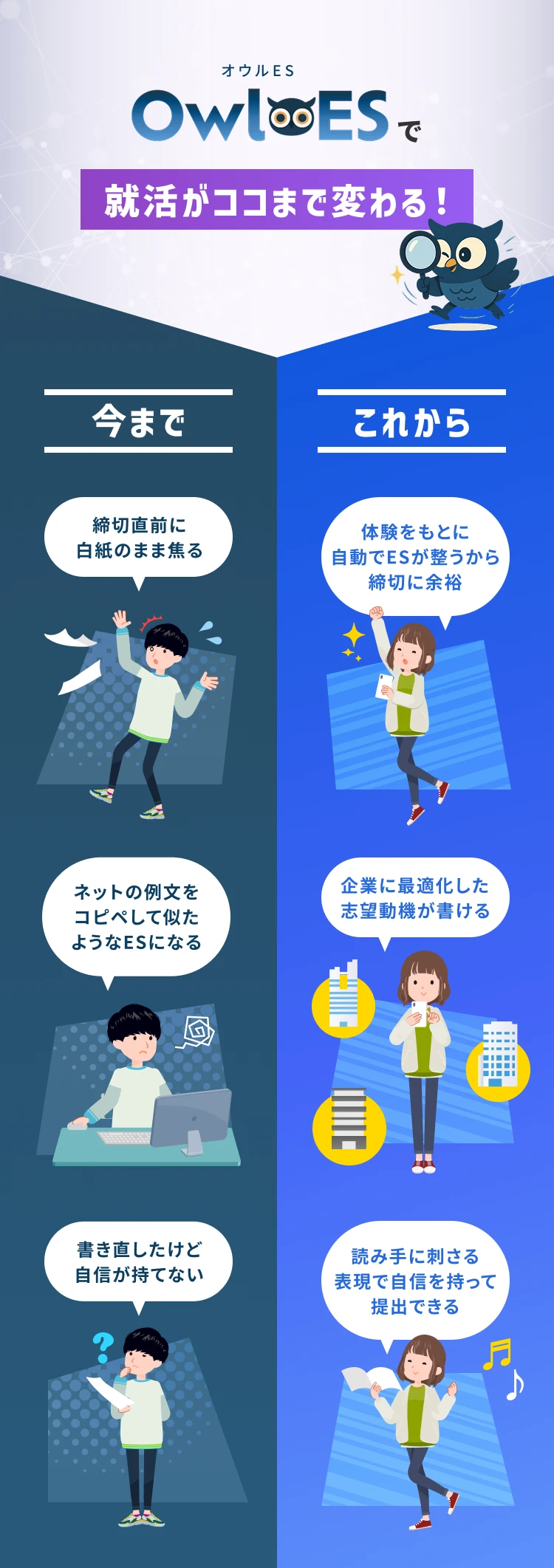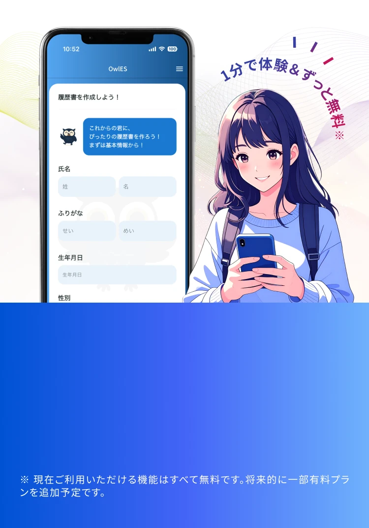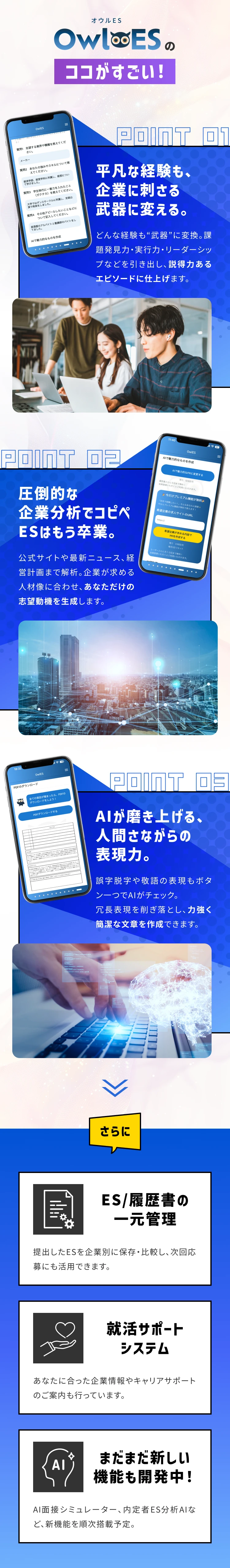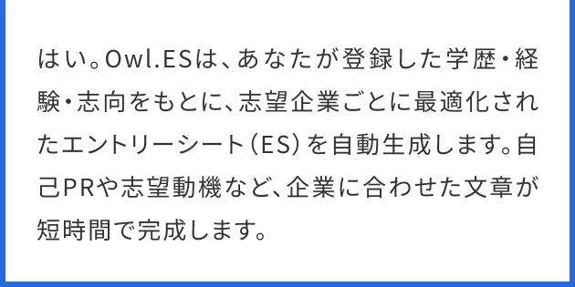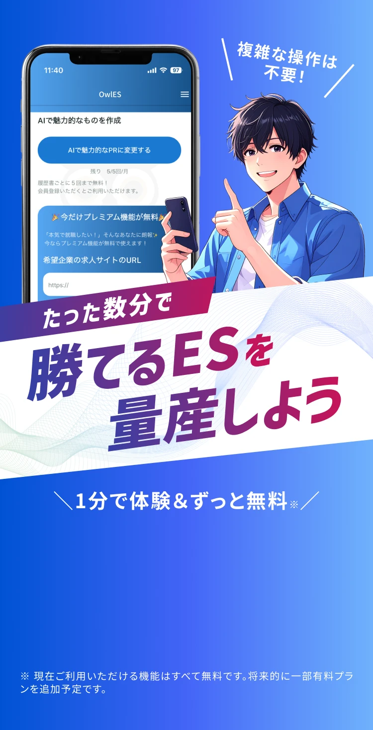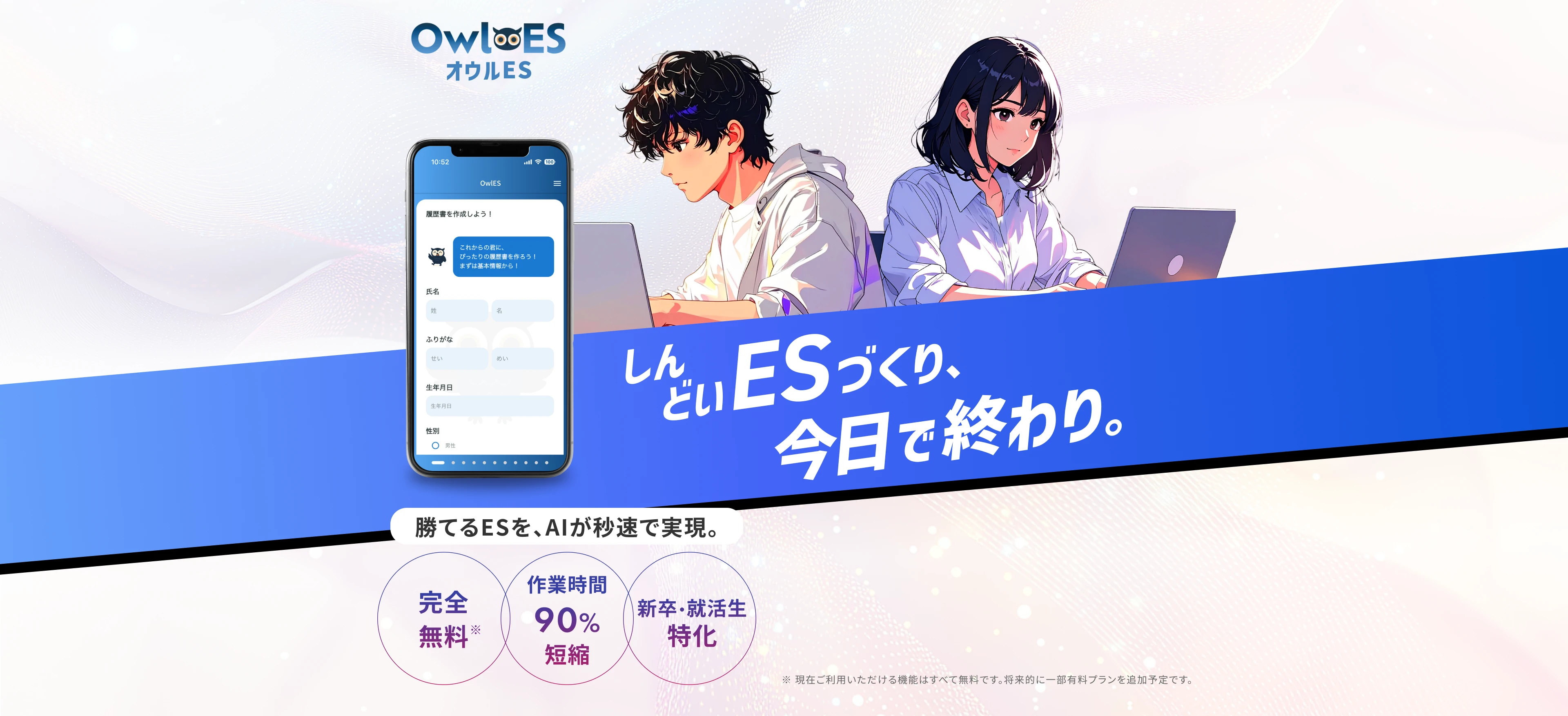 オウルアイ しんどい ES づくり、今日で終わり。勝てるESを、AIが秒速で実現。完全無料 ※ 作業時間90%短縮 新卒・就活生特化 ※ 現在ご利用いただける機能はすべて無料です。将来的に一部有料プランを追加予定です。