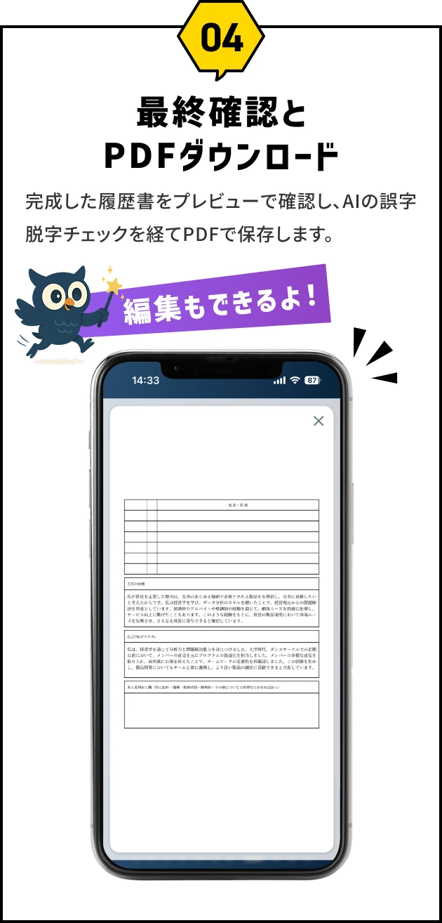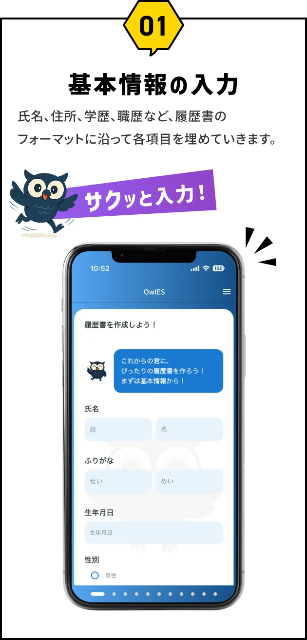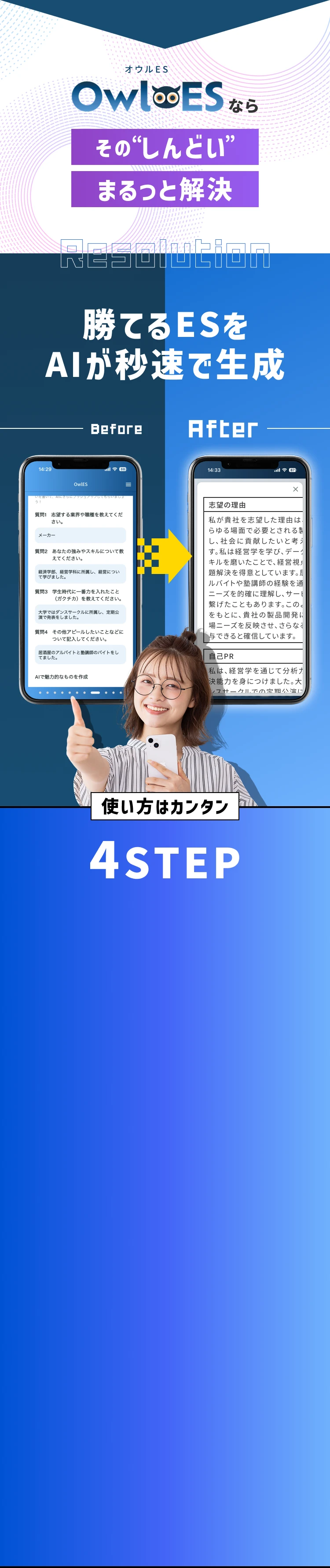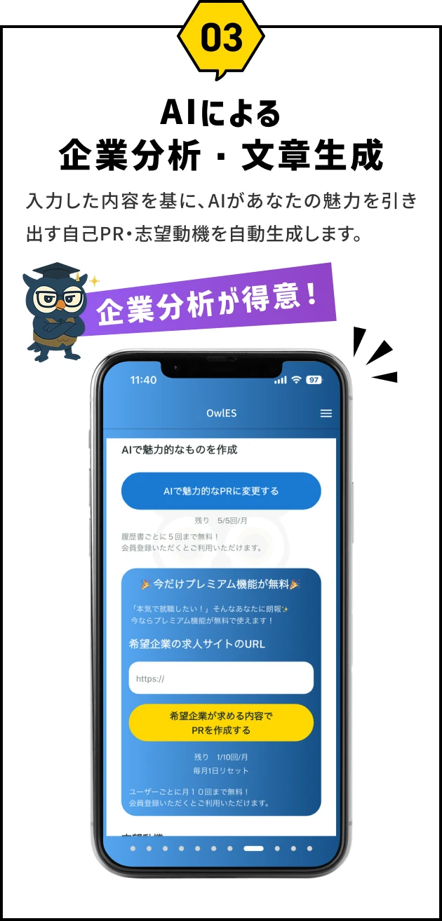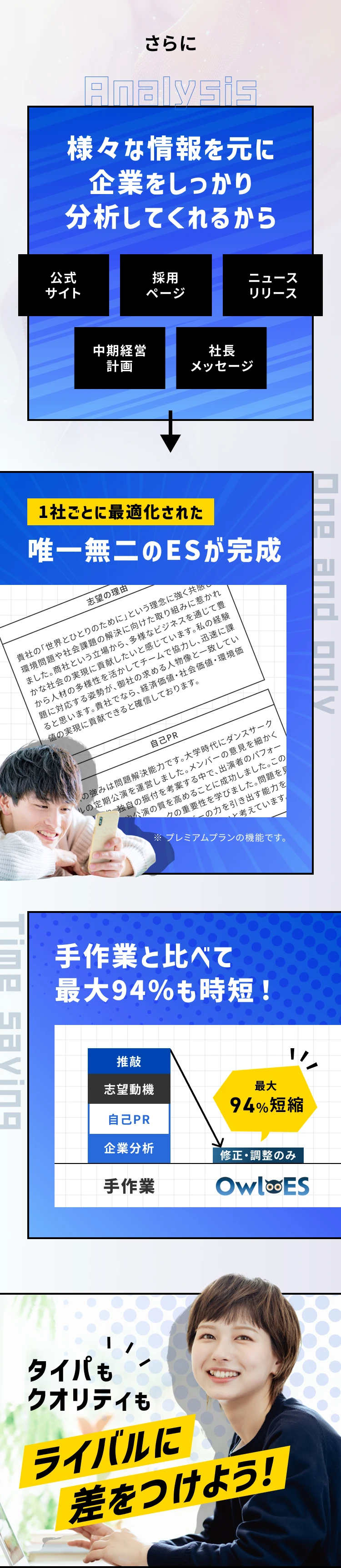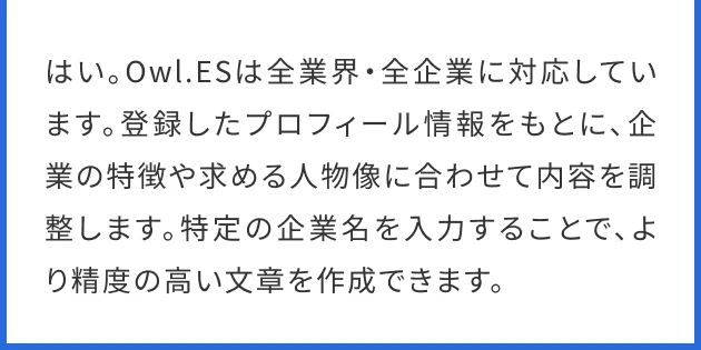 オウルアイ しんどい ES づくり、今日で終わり。勝てるESを、AIが秒速で実現。完全無料 ※ 作業時間90%短縮 新卒・就活生特化 ※ 現在ご利用いただける機能はすべて無料です。将来的に一部有料プランを追加予定です。